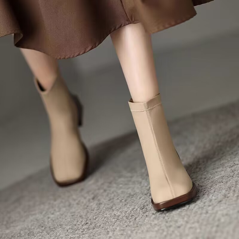 British style thick heel rear zipper Martin boots color-blocked square toe stretch thin short boots autumn and winter single boots for women soft leather