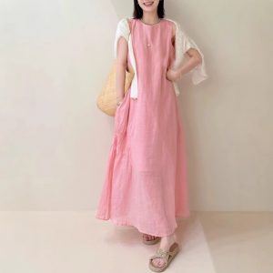 Homemade peach blossom skirt Summer temperament hides flesh and whites high-quality Korean numb loose dress