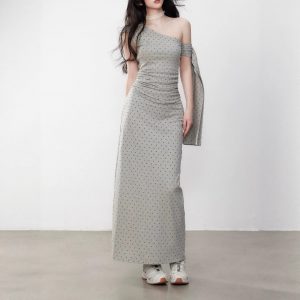 Yuzhi high-end gray off-shoulder dress with pleated waist slim temperament slanted shoulder knitted long skirt summer