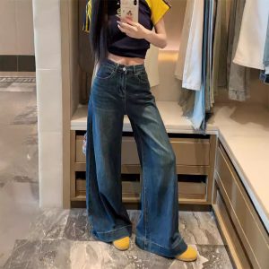 Real shot~ American retro blue flare jeans for women with high waist loose drooping wide-leg floor trousers
