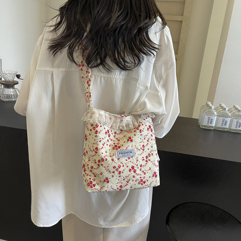 Polka dot lace canvas bag for women single shoulder large capacity tote bag for students class commuting bag