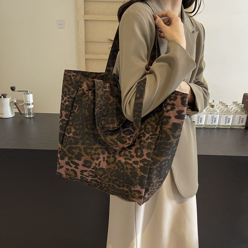 Leopard print canvas handbag retro shoulder bag large capacity underarm bag women