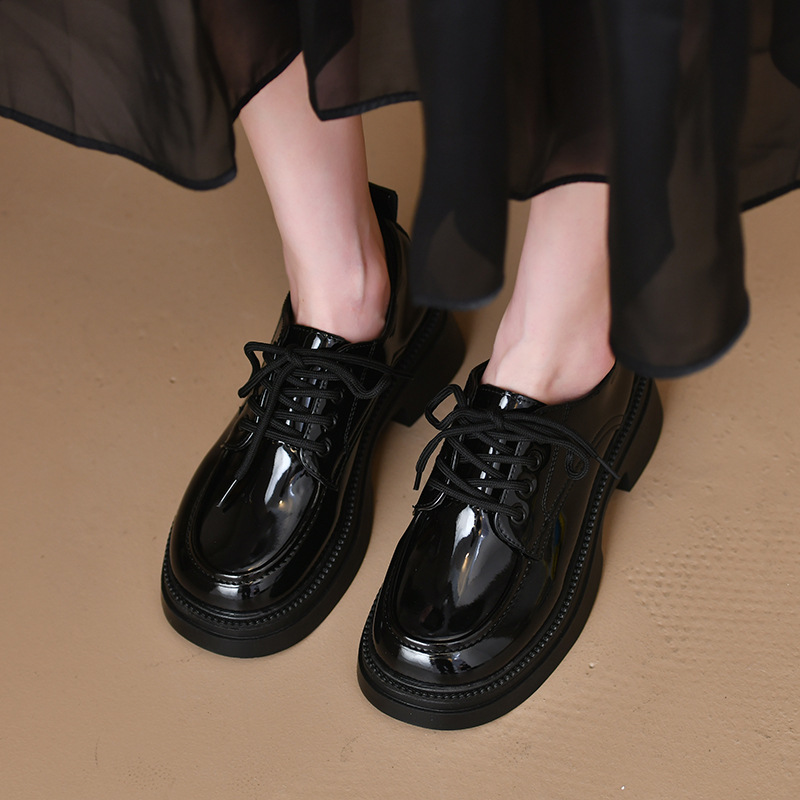 French retro British style small leather shoes for women in spring and autumn thick sole summer and autumn black lace-up shoes