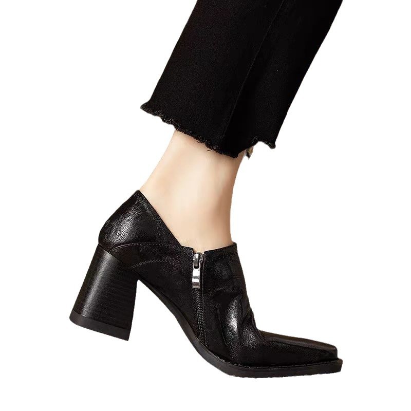 French retro soft leather square-toe high heels for women’s spring and autumn brown thick heels deep mouth side zipper single shoes
