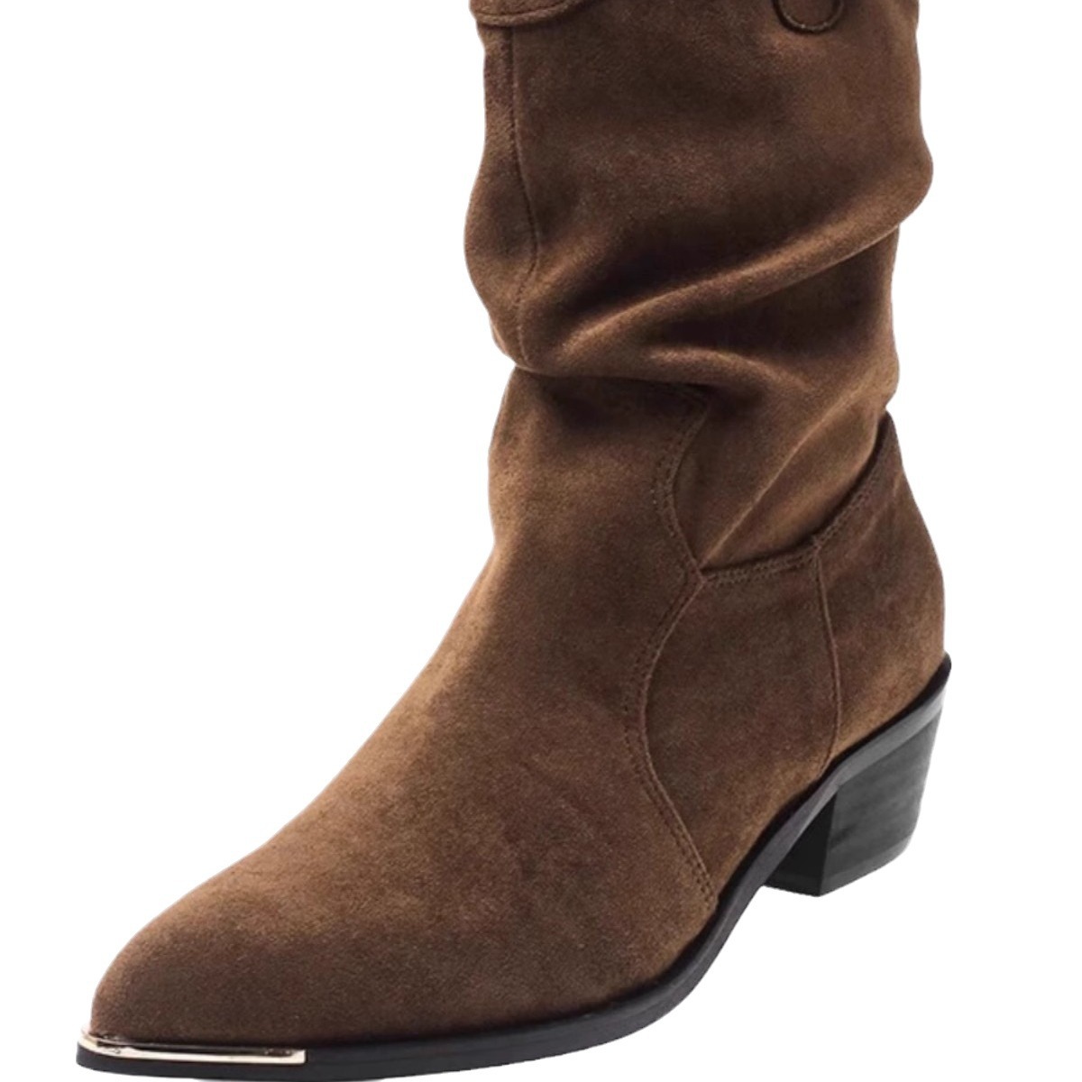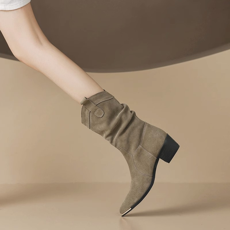 Frosted soft leather pile boots for women’s autumn and winter pointed toe knight boots thick heel retro western denim boots