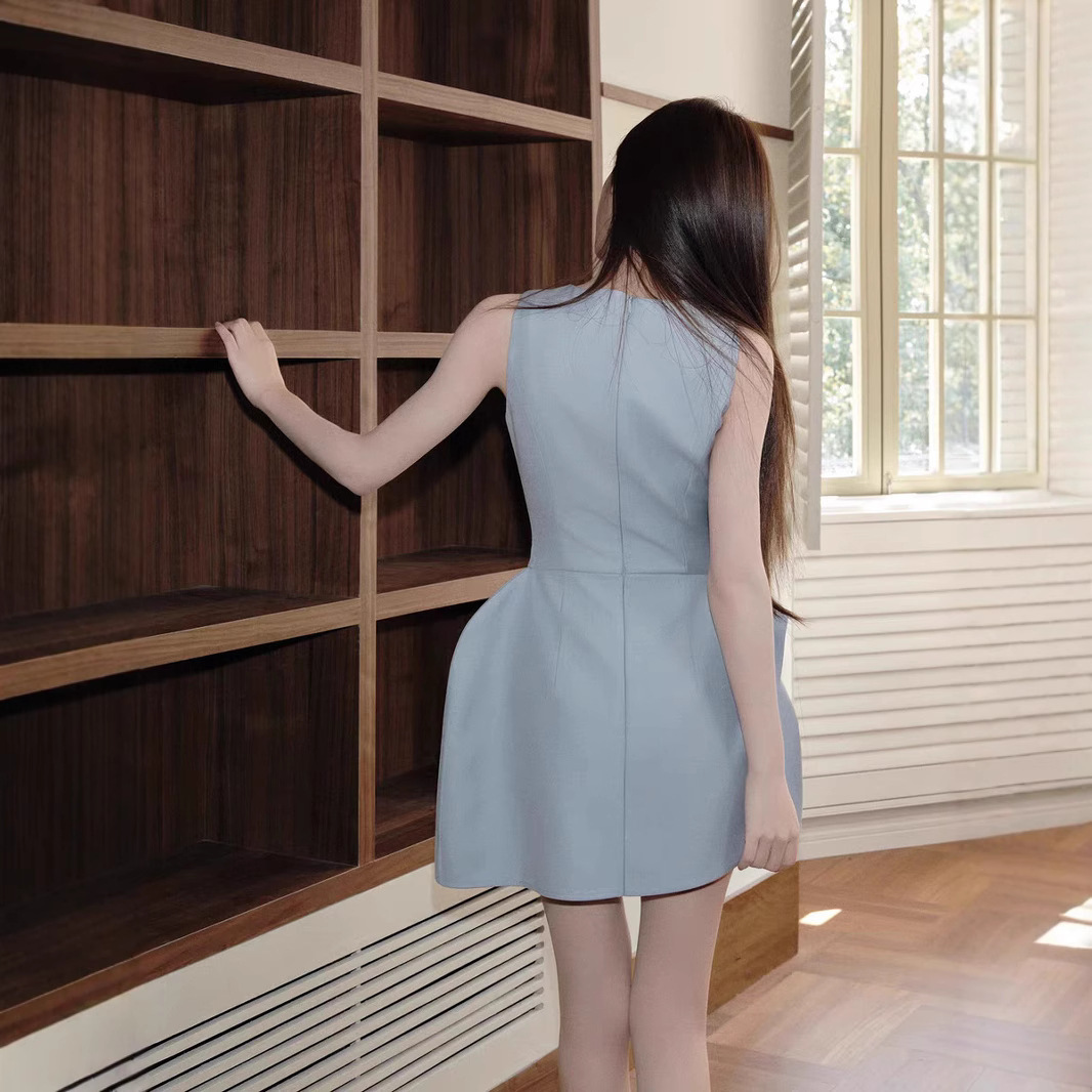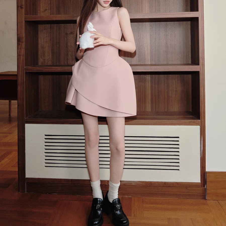 /Irregularly cut sleeveless dress with flower bud skirt with waist-hugging short skirt for women