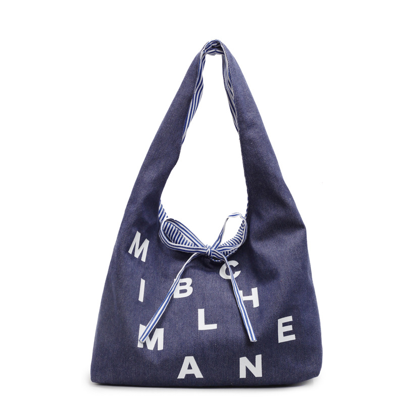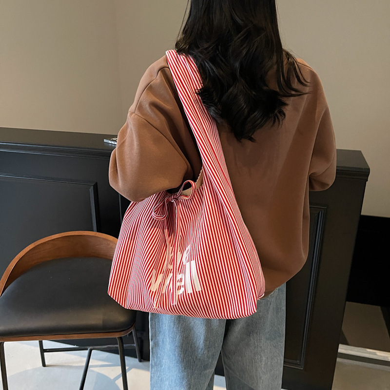 Large capacity Tote front and back double-sided striped casual one-shoulder texture embroidered canvas bag student commuting