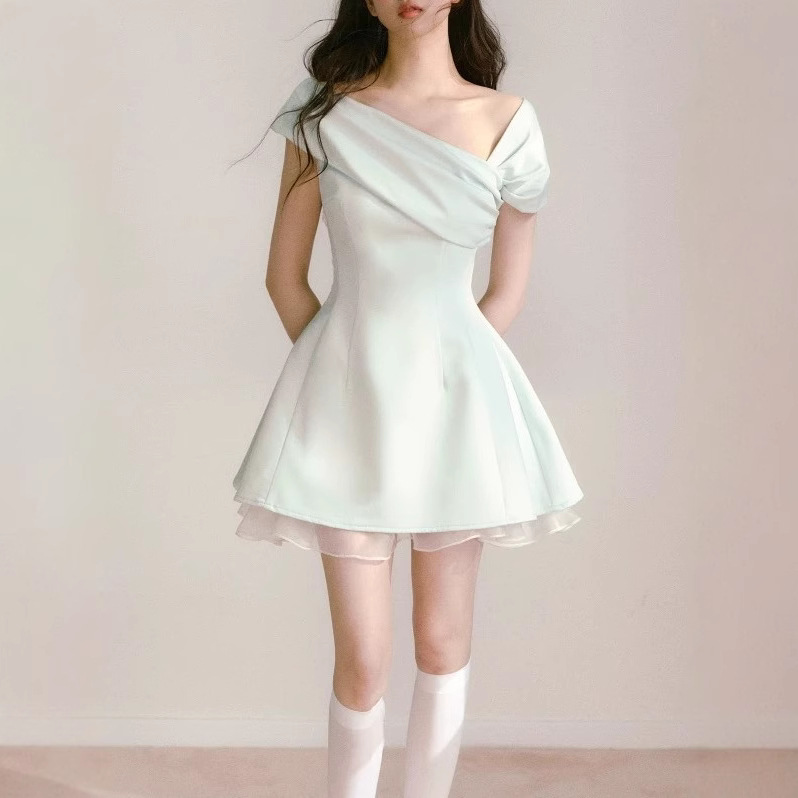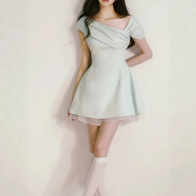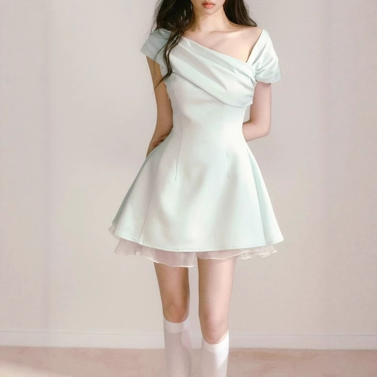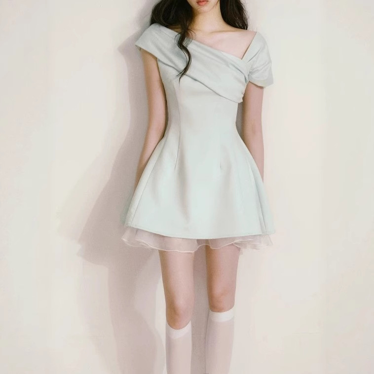 Mint green one-line side-shoulder dress for women in summer, niche design unique and beautiful waist-pinching skirt