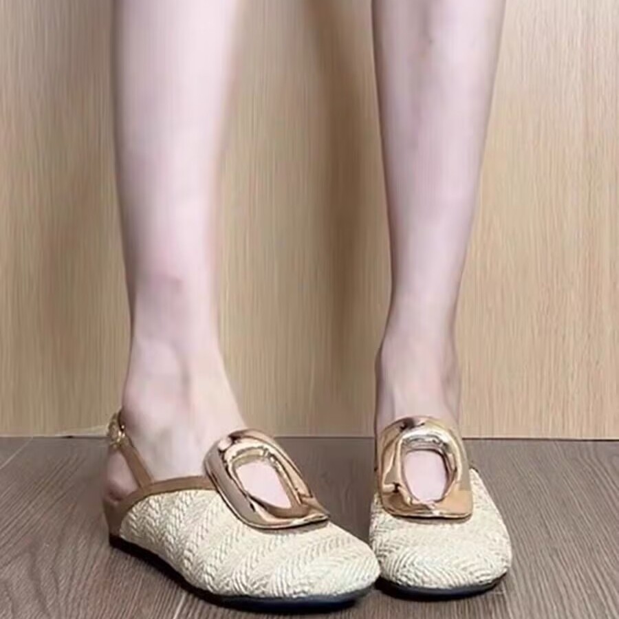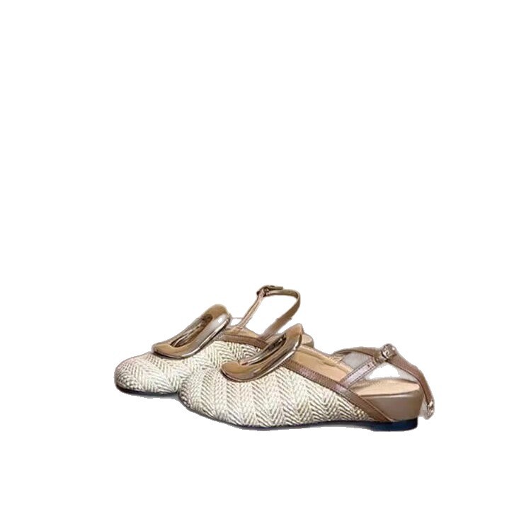 Niche personalized design sense straw-woven vacation style toe shoes for women in summer trip-belt hollow heeled semi-slippers