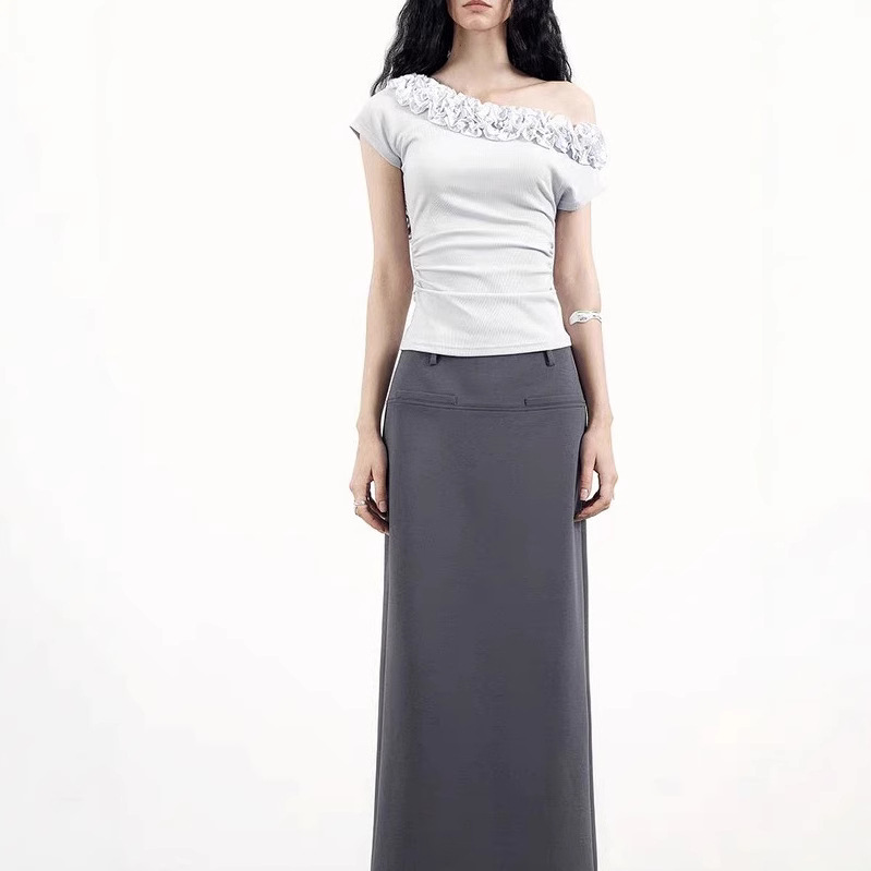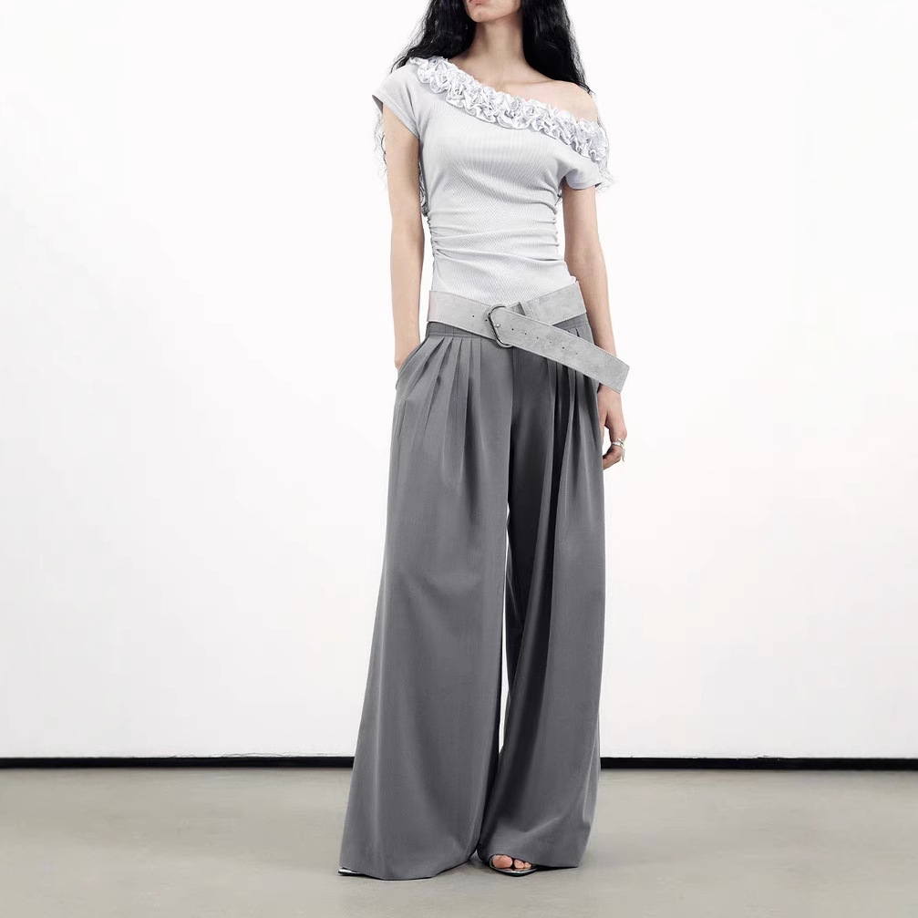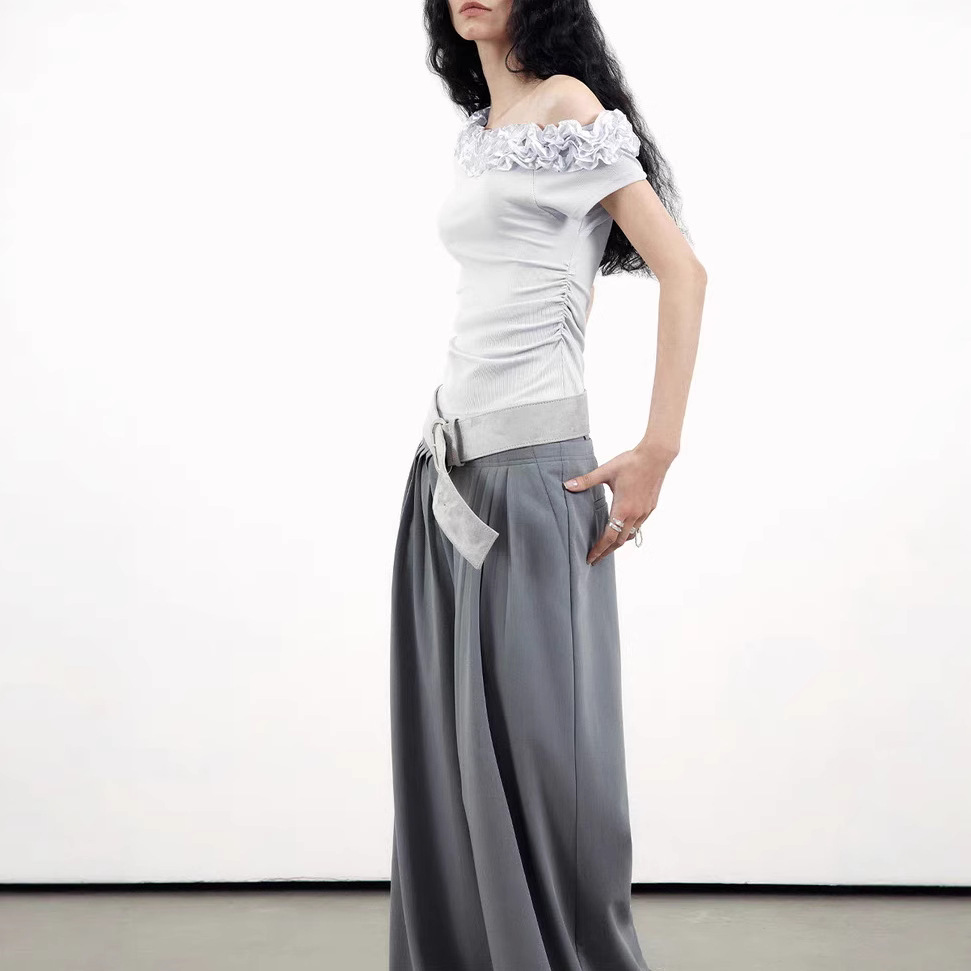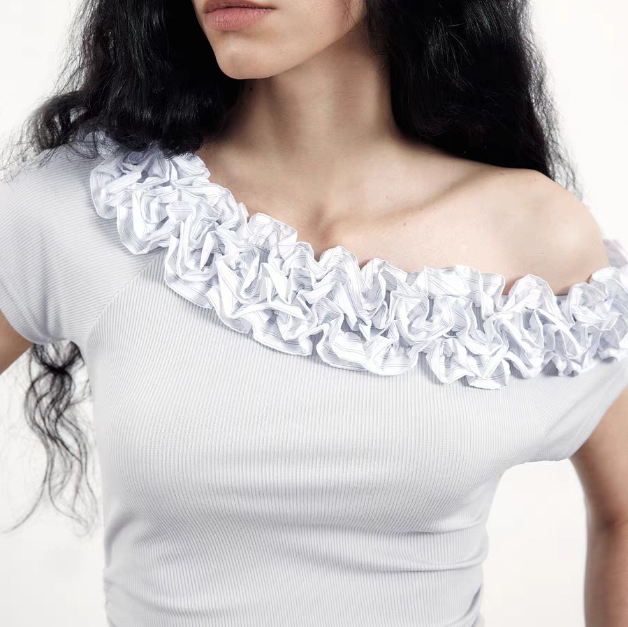Original niche design multi-layer lace slanted shoulder shirt for women