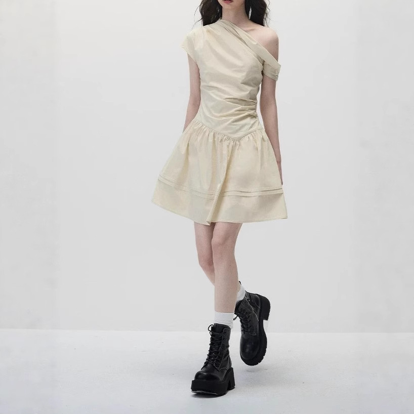 Original summer design and temperament, waist-hugging and slimming shoulder-shaped beige dress for women
