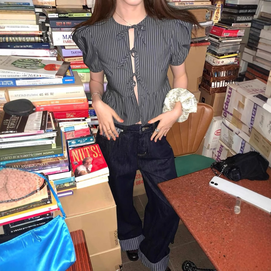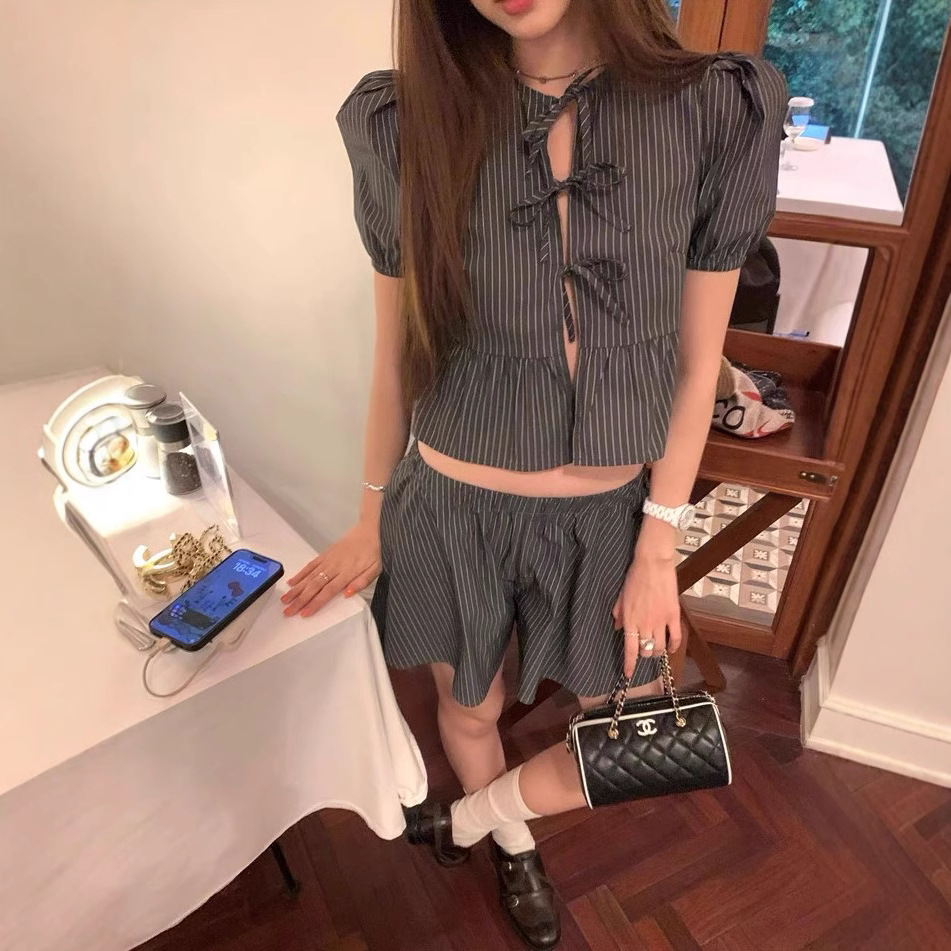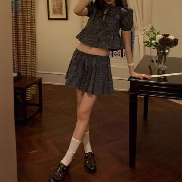 Proportional sweetheart Niche retro striped lace-up puff sleeve short sleeve shirt skirt pants