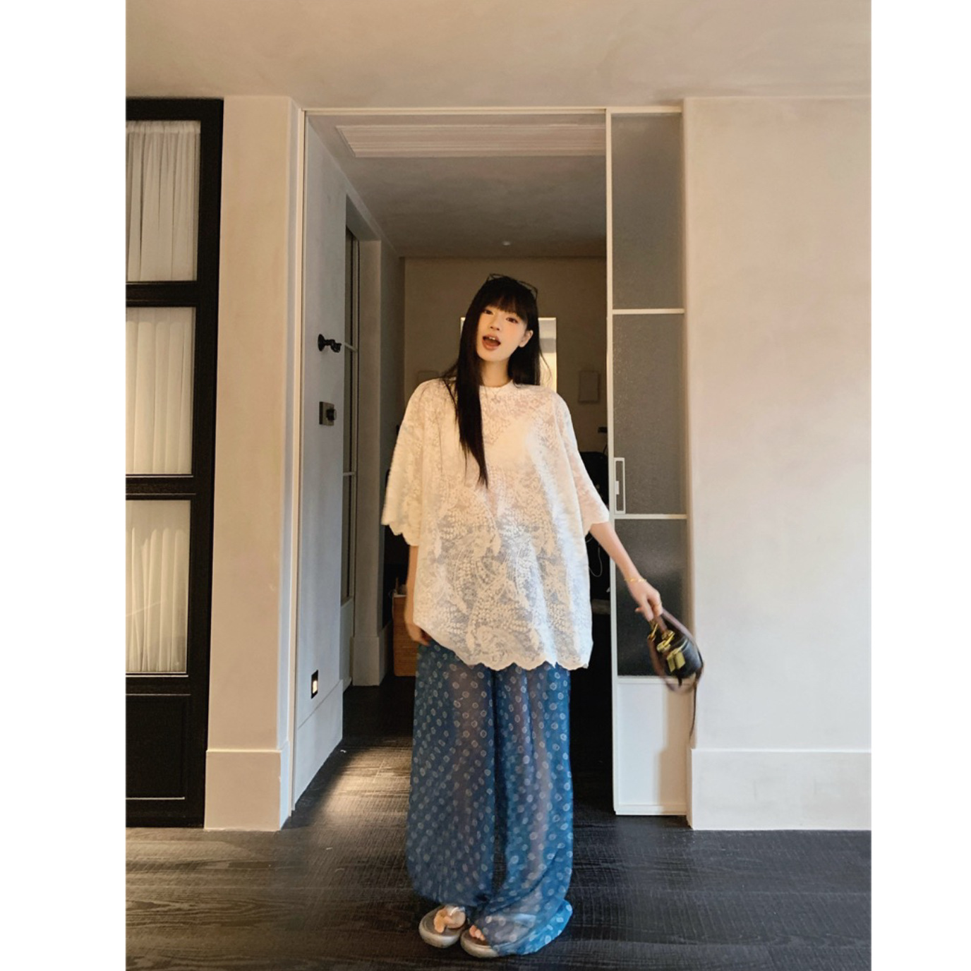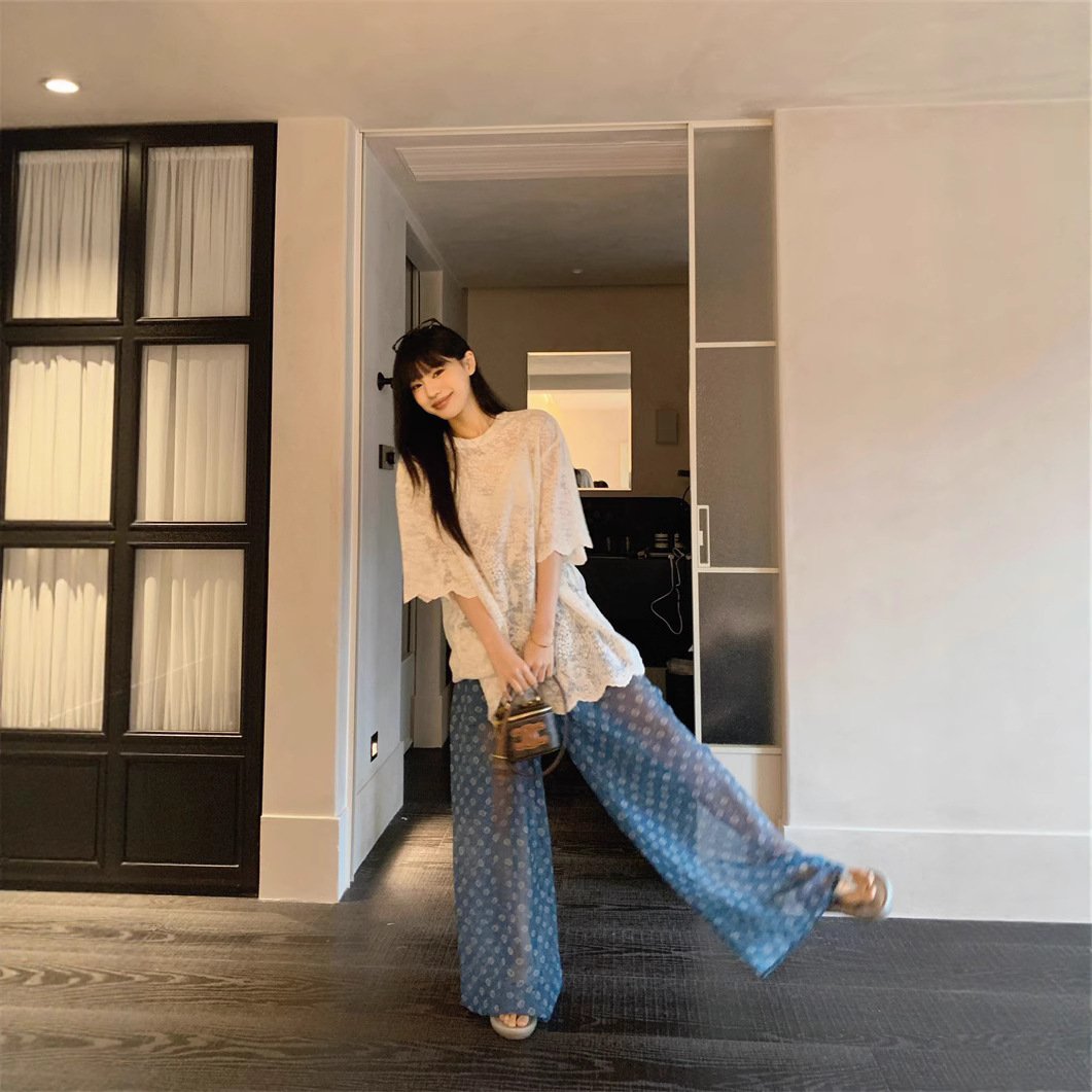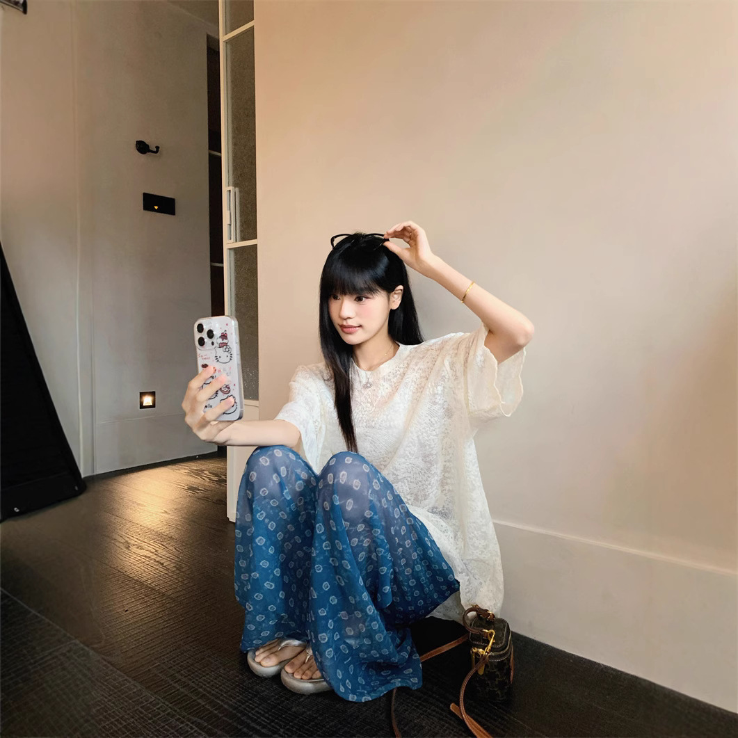 Real-life design-sensing hook-flowered hollow lace shirt thin layered sunscreen blouse printed sunscreen trousers fashion suit