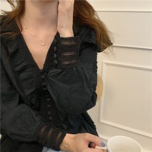 Real photo of embroidered lace spliced ​​long-sleeved shirt for women in spring and summer loose puff sleeve shirt