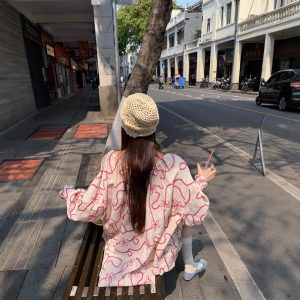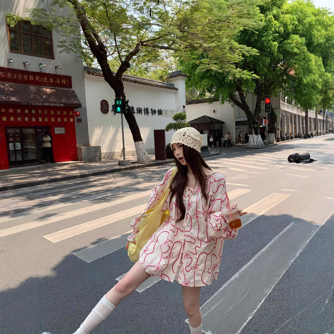 Real photo of embroidered long-sleeved shirt for women design layer cake short skirt casual suit