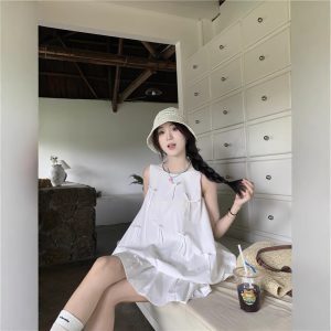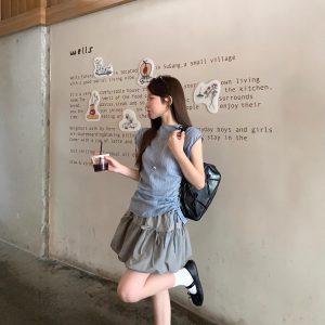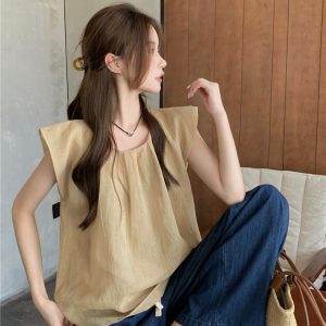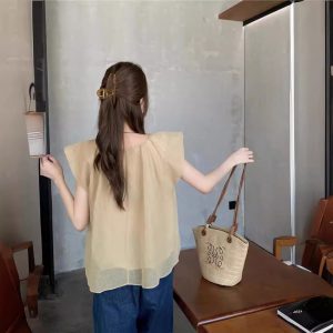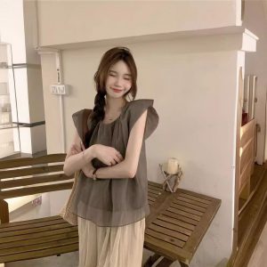 Real photo of Korean retro simple loose solid color shirt wrinkled cotton linen small flying sleeve round neck pullover top