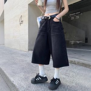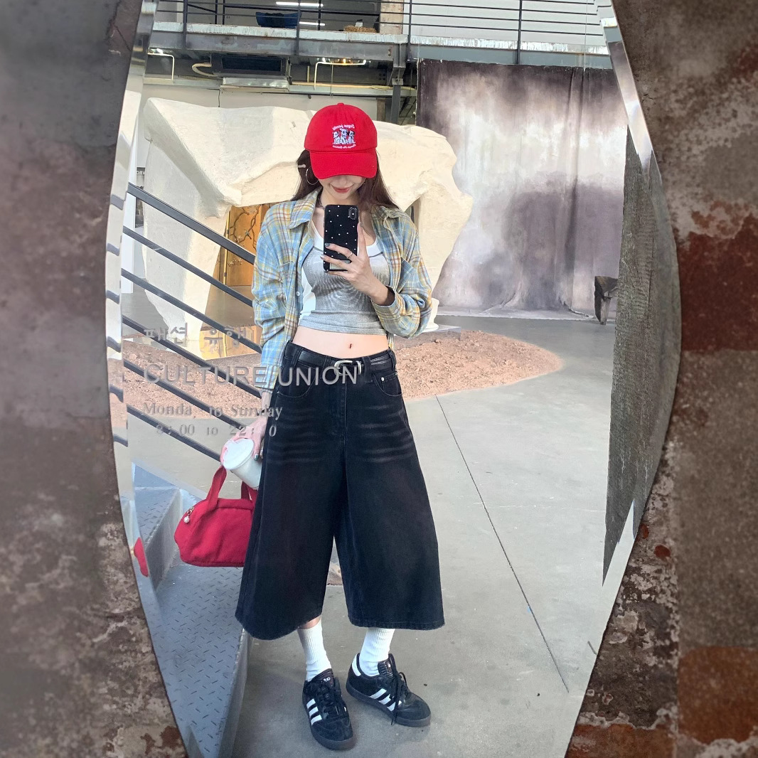 Real photo of summer American black wide-leg pants split jeans retro washing and old-top pants design