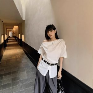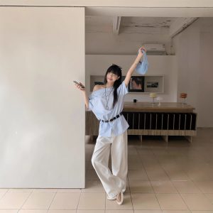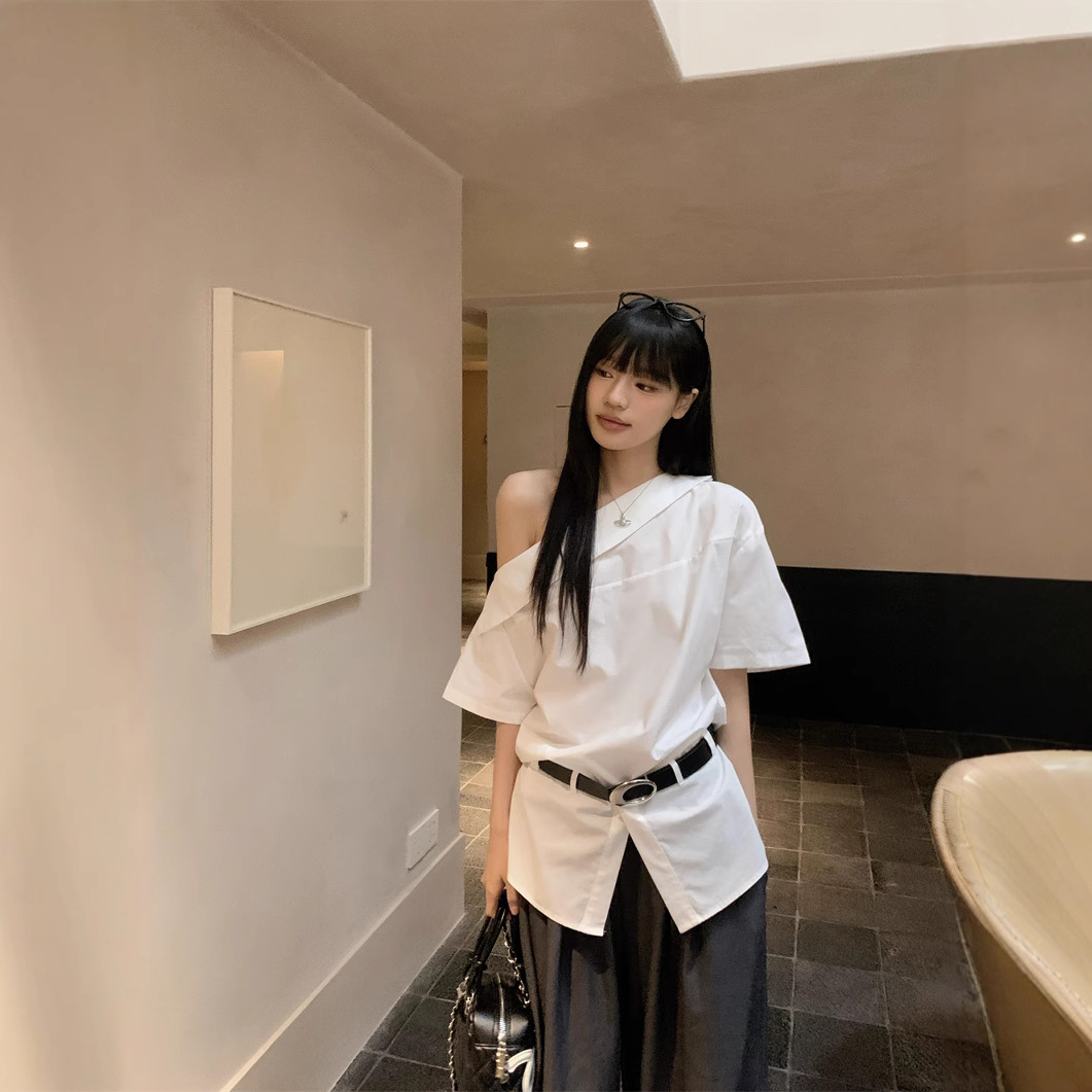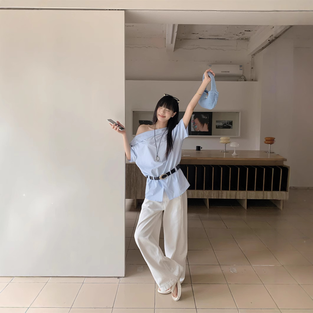 Real photo of summer design off-shoulder mid-sleeved shirt for women with belt
