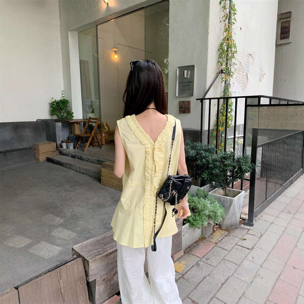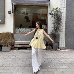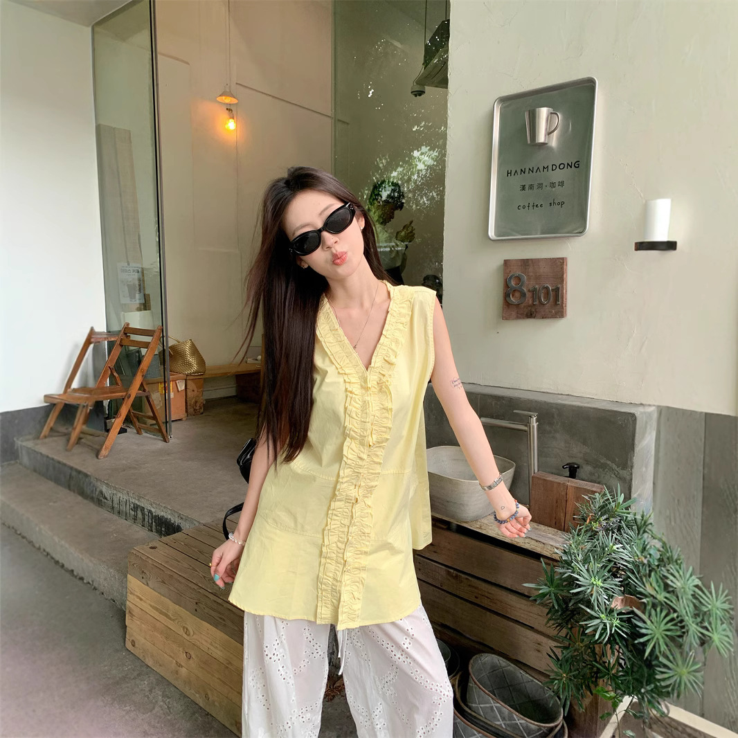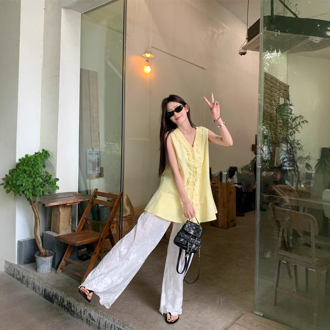 Real photos of Korean style, loose slim collar shirt, casual and versatile lace wide-leg pants suit for women