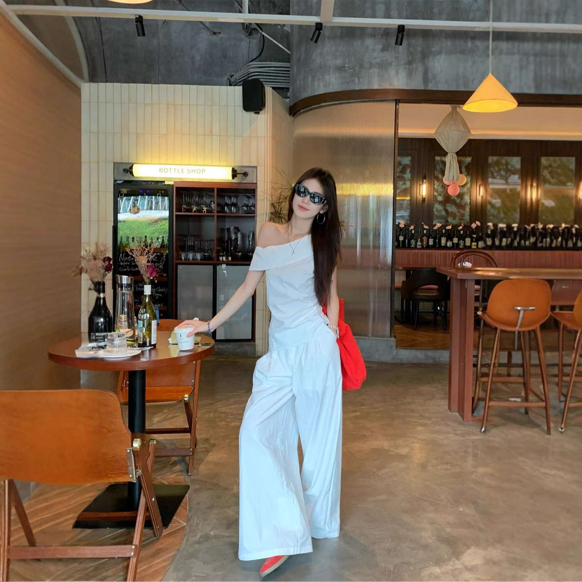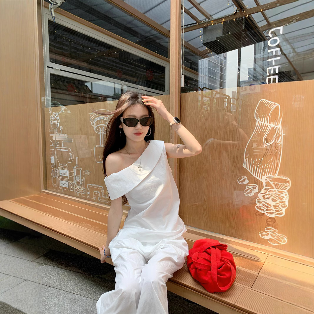 Real photos of summer casual, versatile and fashionable niche design, off-shoulder sleeveless top and pants set