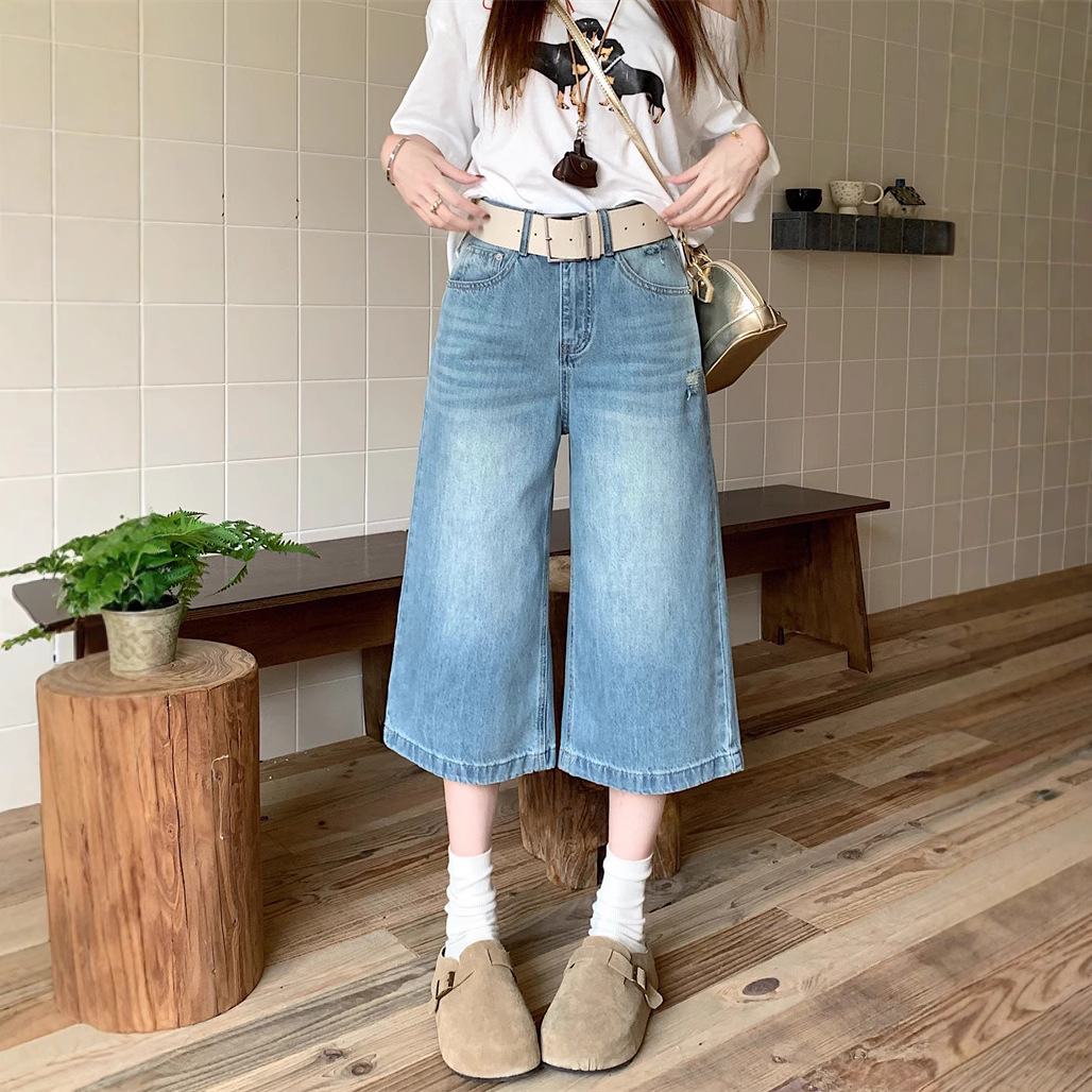 Real shot of American retro high street denim trousers for women in summer high waist ripped wide-leg trousers
