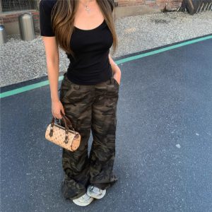 Real shot of retro camouflage denim wide-leg work pants for women in spring and summer American hot girls high waist slim casual trousers trendy