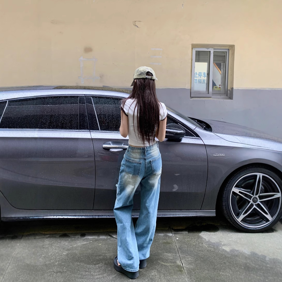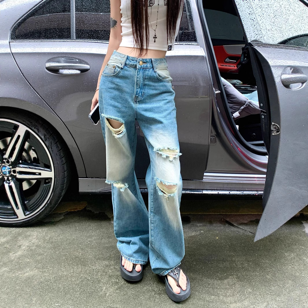 Real shot of summer American ripped wide-leg pants for women with high waist loose slim jeans