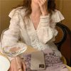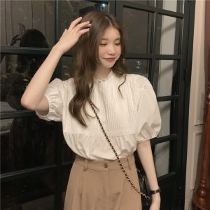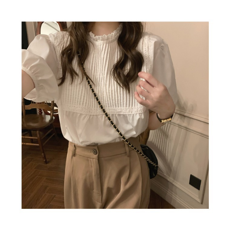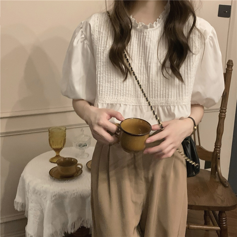 Real shot of summer white puff sleeve shirt for women in women’s French retro gentle round neck temperament short-sleeved top