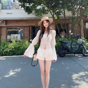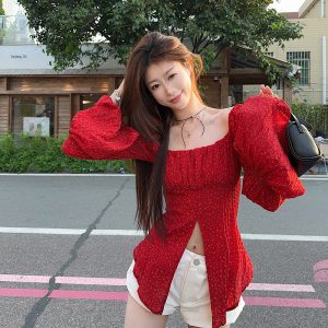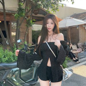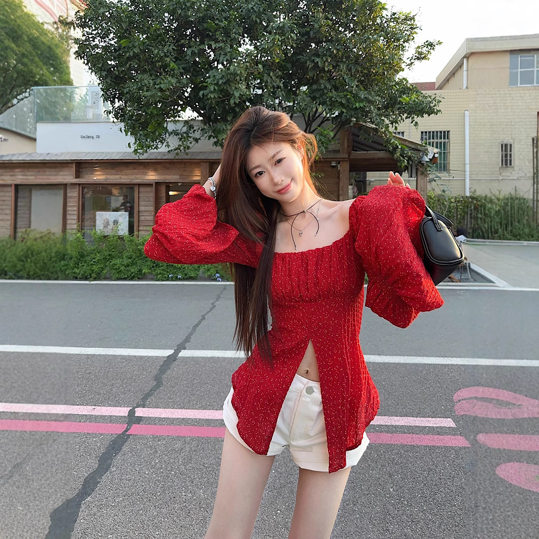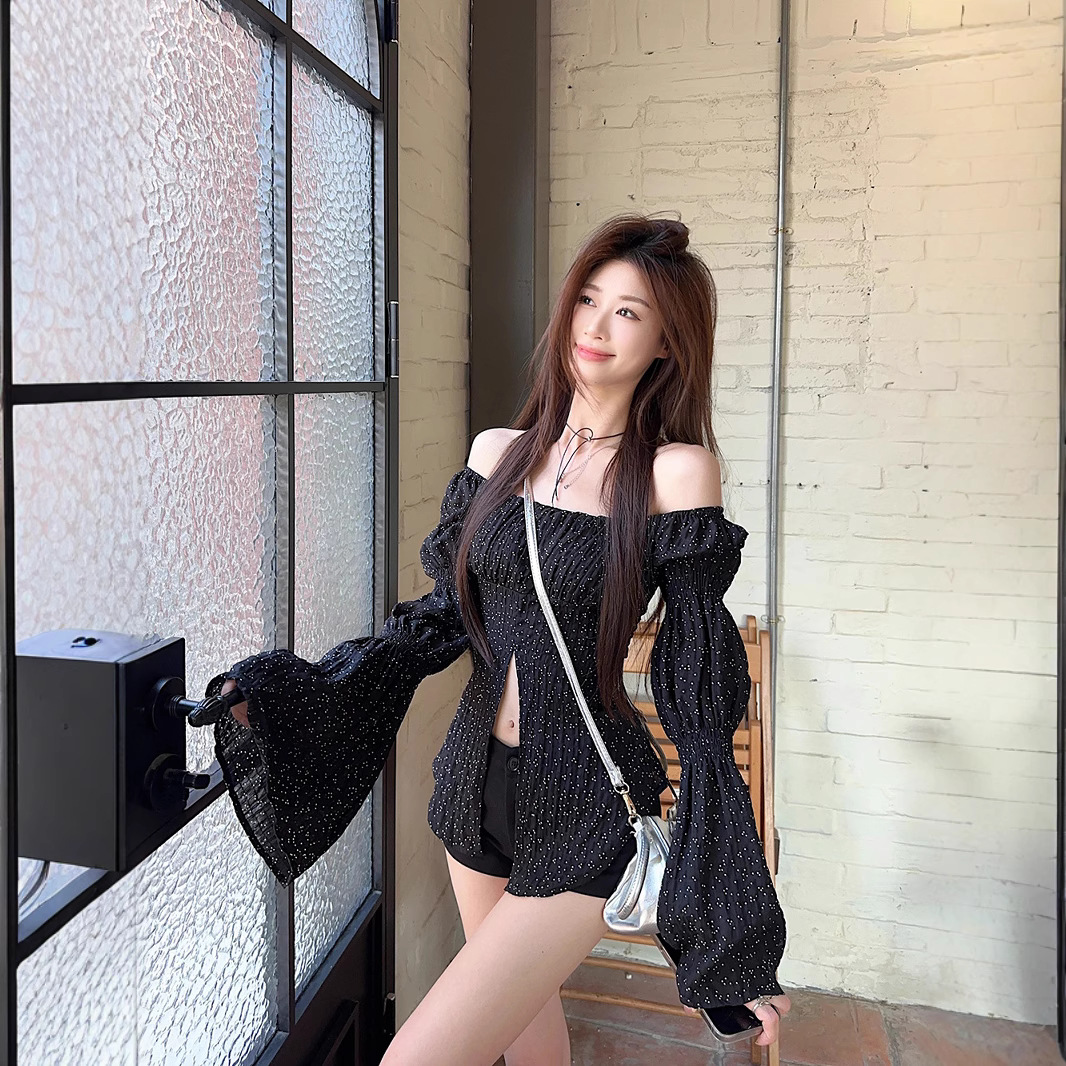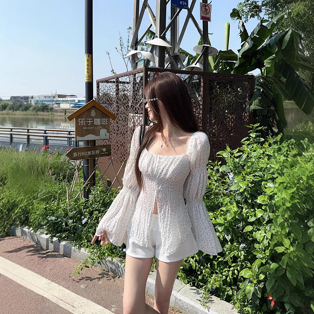 Real shot~ Spring and summer hot girls retro generous collar polka sleeve slit polka dot chiffon shirt sun protection top