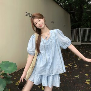 Real shot~ Summer loose and versatile short-sleeved shirt top elastic waist wide-leg short skirt casual suit