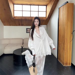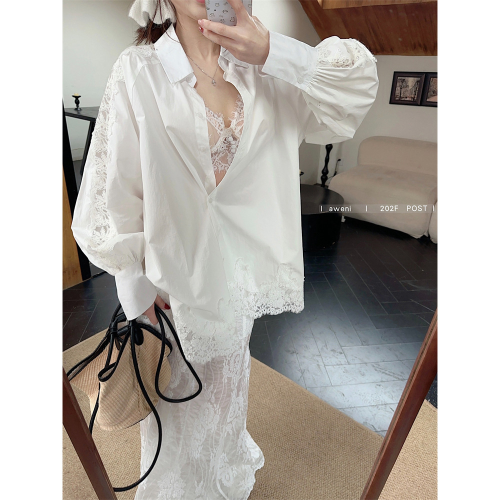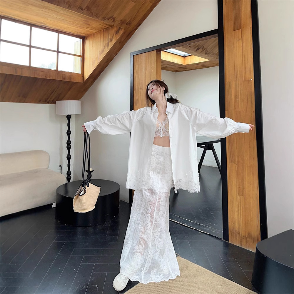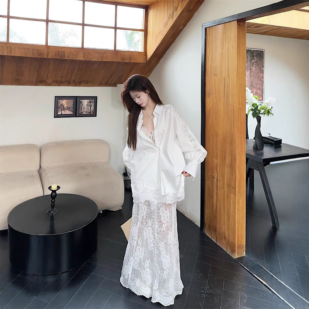 Real shot~Design-sensual lace spliced long-sleeved shirt for women + lace underwear + high-waisted skirt three-piece set