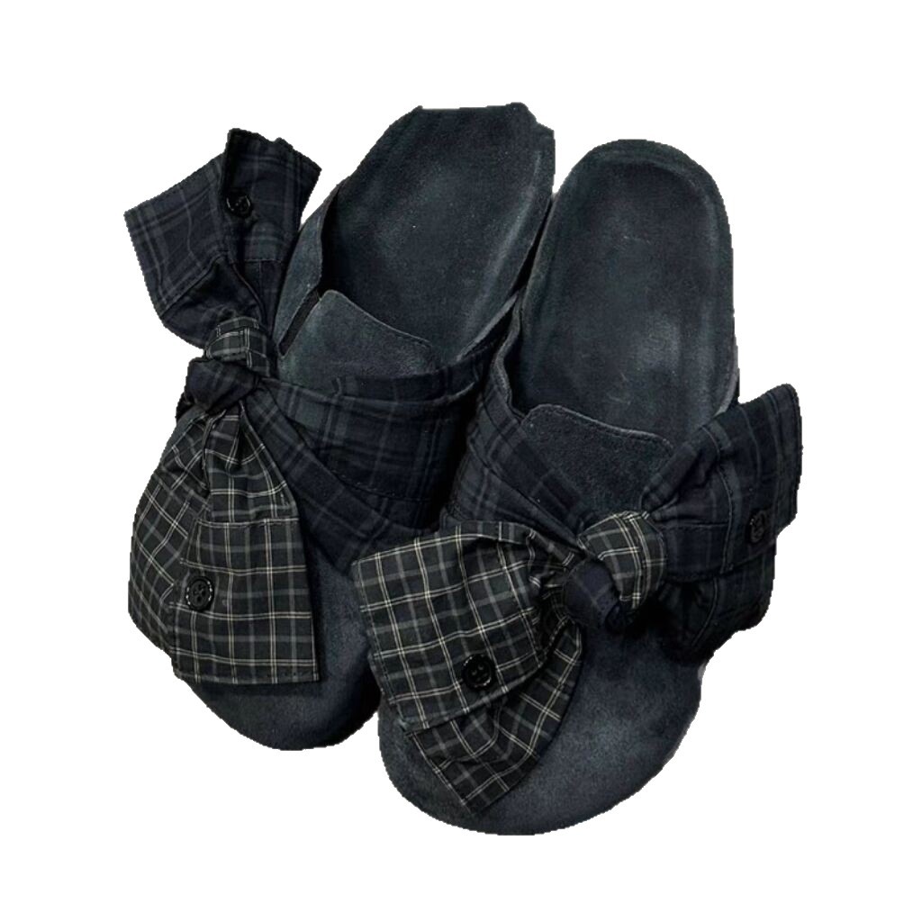 Retro denim plaid bow bag half slippers for women in summer wear lazy sandals