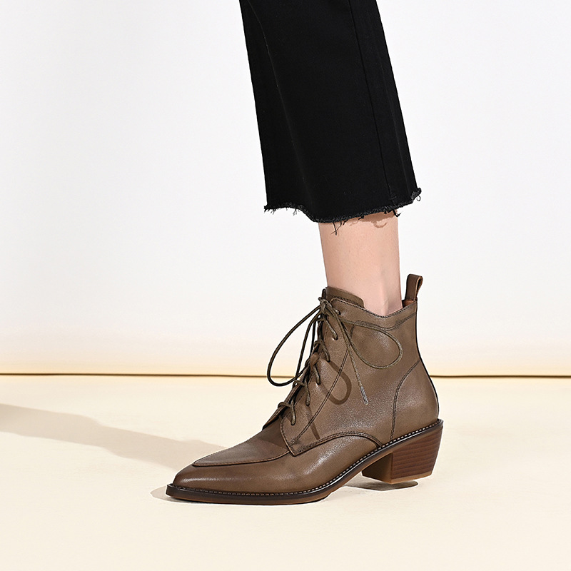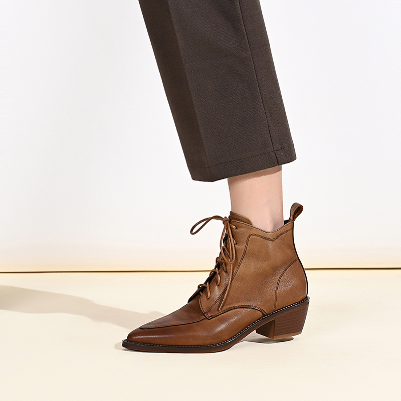 Retro French pointed-toe short boots for women’s middle heel lace-up Martin boots for autumn and winter women’s boots thick heel soft leather ankle boots