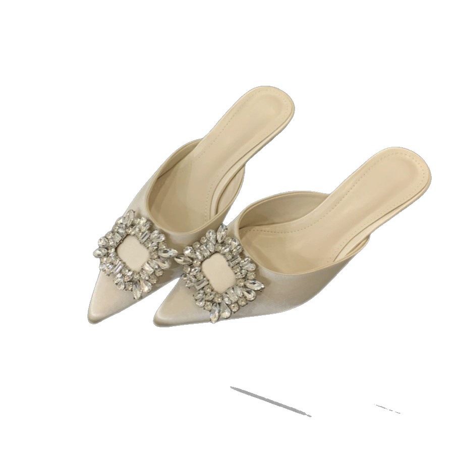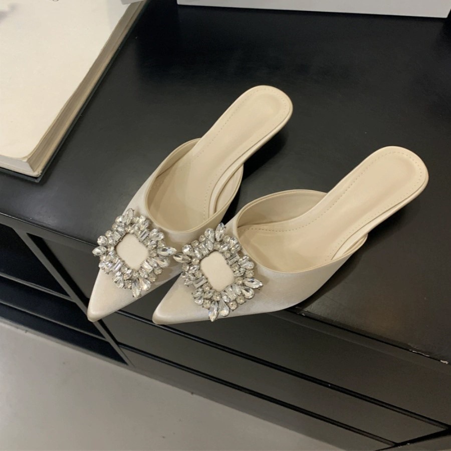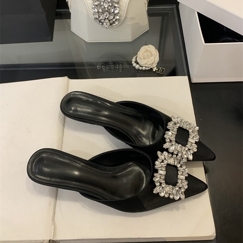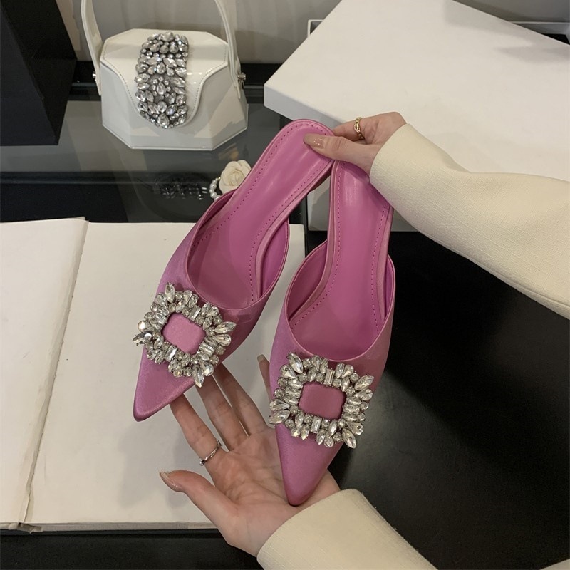 Satin-faced low-heeled rhinestone square buckle half-slippers for women in summer wear pointed-toe thick-heeled lazy mules
