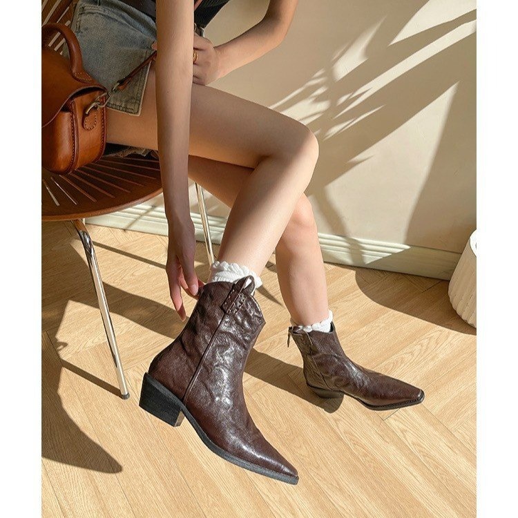 Short boots for women Martin boots soft leather nude boots pointed toe brown thick heel western cowboy boots for women