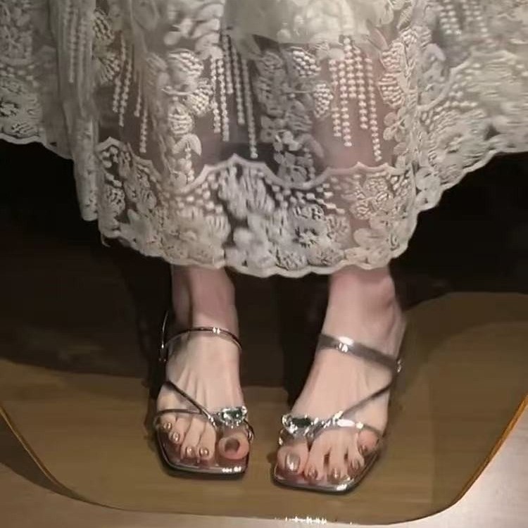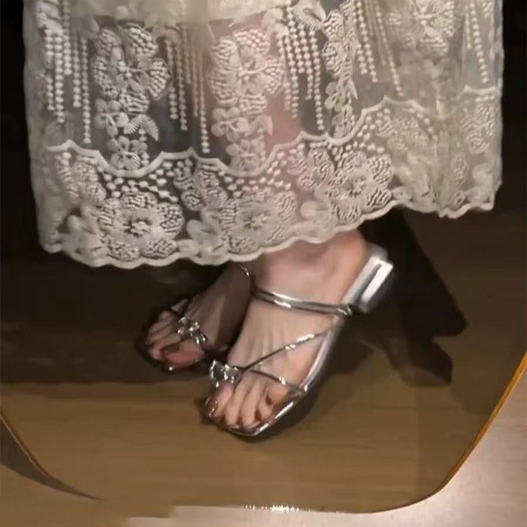 Soft leather version! Wear high-end silver rhinestone clip-on thick heels on the outside, so you can wear beautiful sandals on the outside in summer