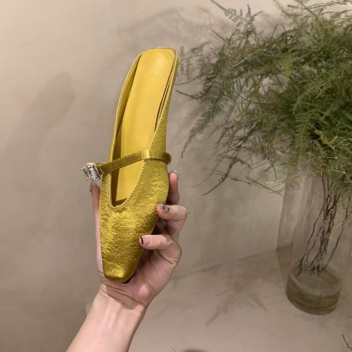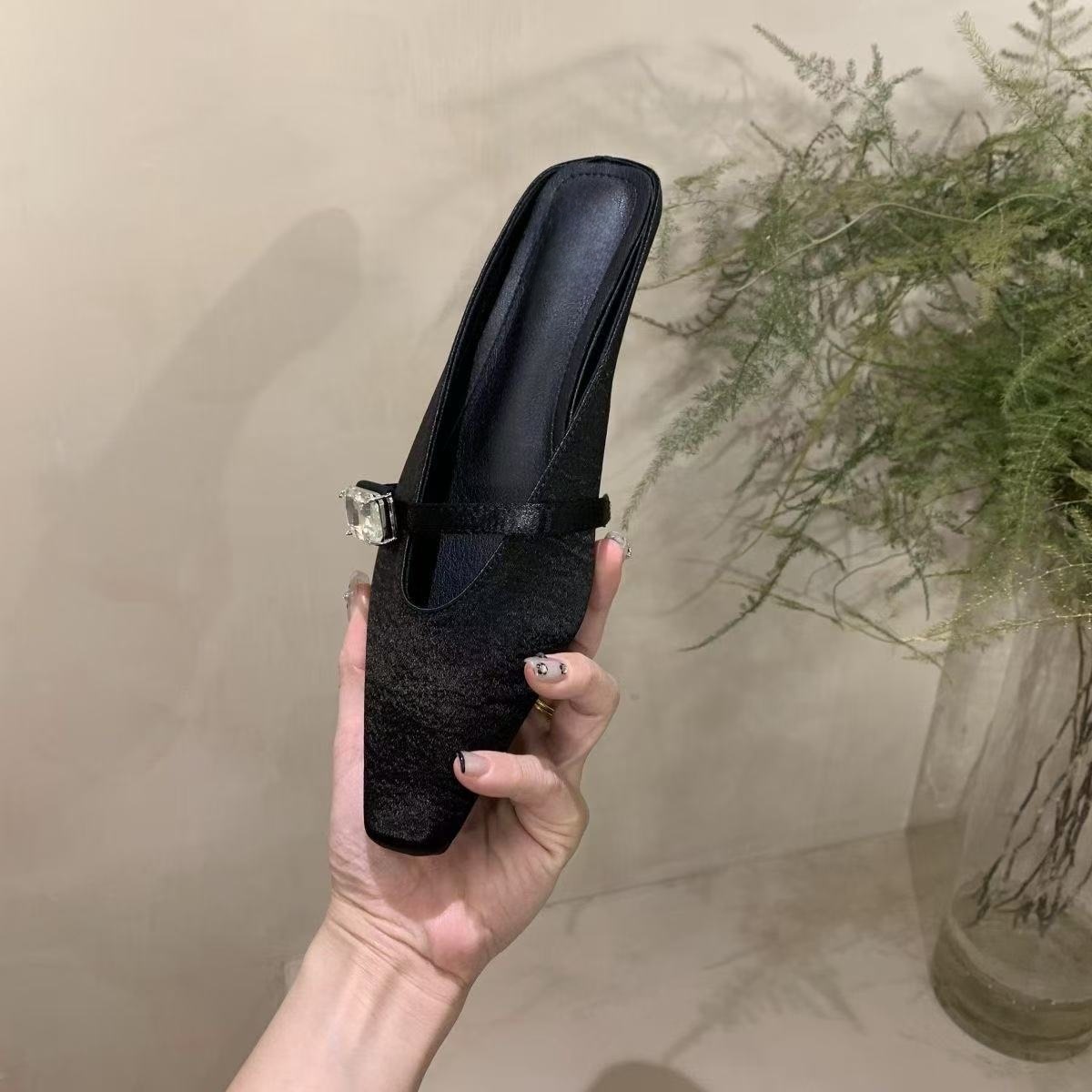 Spring and summer women’s shoes fashionable satin rhinestone square-toe slippers for women flat heel bag half-slippers for women