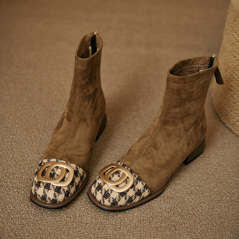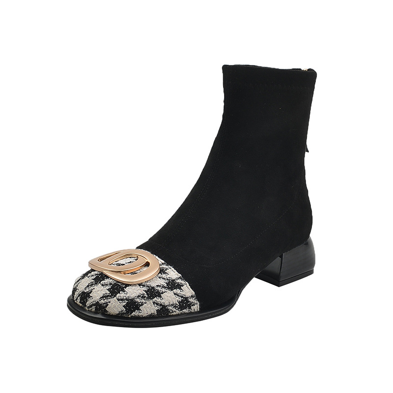 Square toe thick heel metal buckle thin boots for women in autumn and winter middle heel rear zipper short boots for thousands of bird color-blocking fashion boots