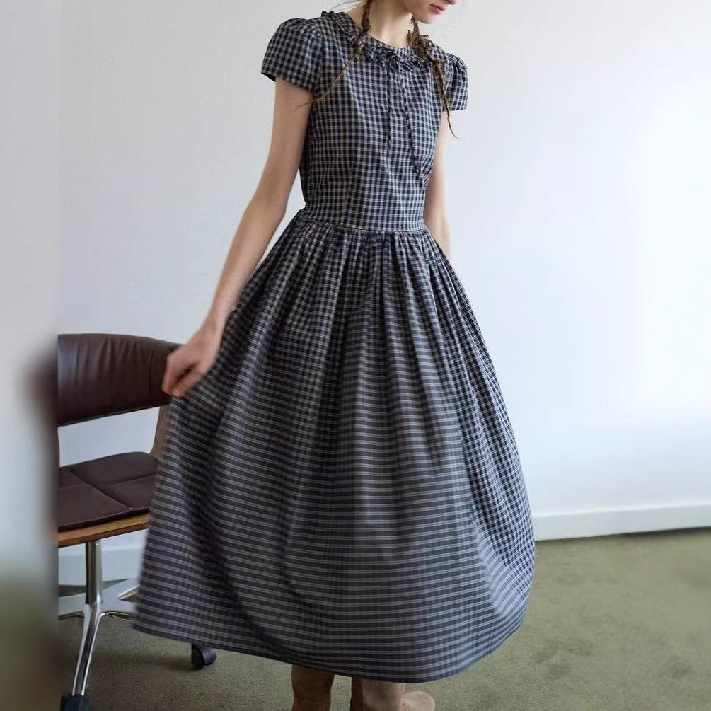 Summer Symphony’ retro plaid decorative earrings micropuff sleeves high waist big skirt dress for women