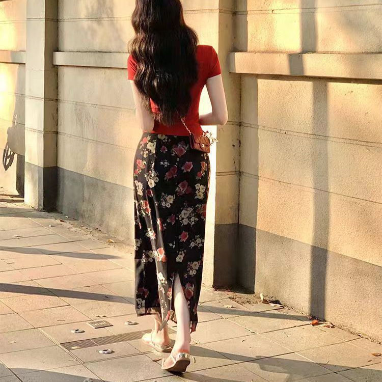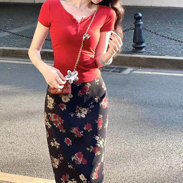 Yiyao Korean pure temperament knitted sweater for women in summer slim short-sleeved top + floral skirt suit