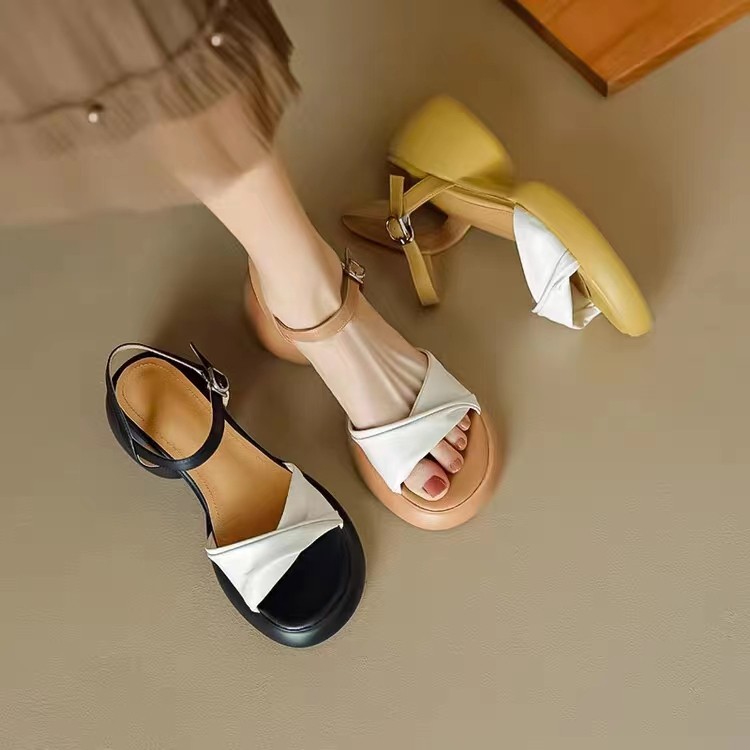 Summer color-blocked large round toe thick-soled thick heeled sandals for women with one-liner straps, open toe, waterproof platform high heels