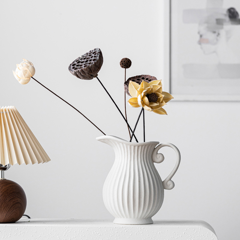 Retro wide-mouth striped ceramic vase high-end feeling small fresh simulated green plants fake flowers home decoration